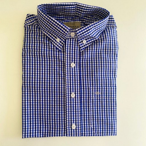 Camisa de manga larga con diseño de cuadros en tonos blanco, azul y amarillo.